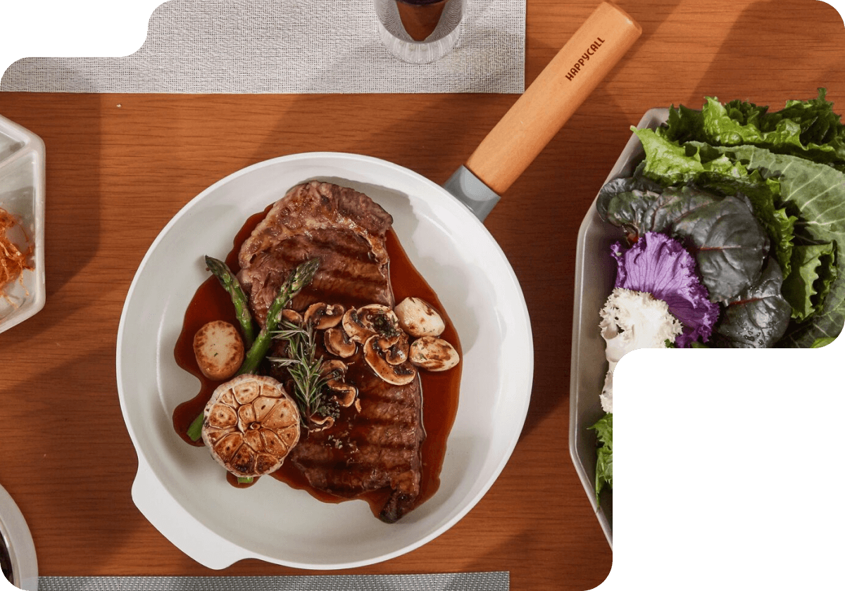Happycall первыми придумали двойную сковороду, которая является эталоном качества. Она позволяет переворачивать блюда без брызг и потерь сока. Создаёт эффект духовки и ускоряет процесс приготовления.